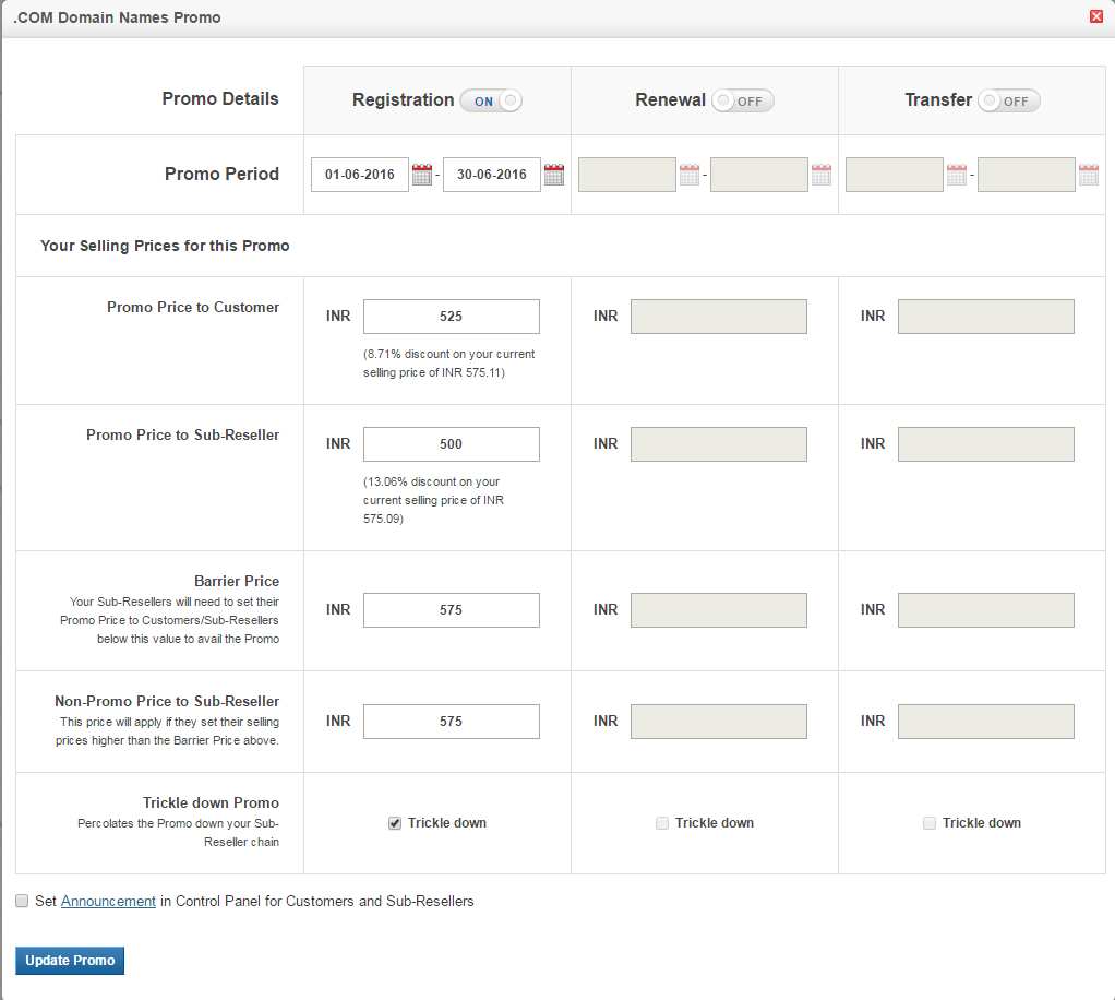 - Trickle down Promo: Selecting this checkbox will offer the Promo to all the Sub-Resellers in your Reseller chain.