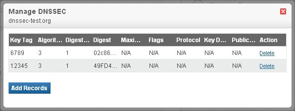 NoteThe Manage DNSSEC view will display a list of DS Records, if already added. Here, click the Add Records button to proceed.
