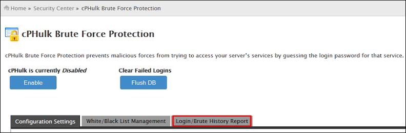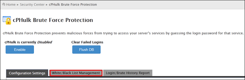 Navigate to Home -> Security Center -> cPHulk Brute Force Protection.