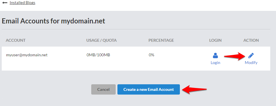 Click on Create New Email to add a new email account. Or click on Modify to update or delete an existing email account.