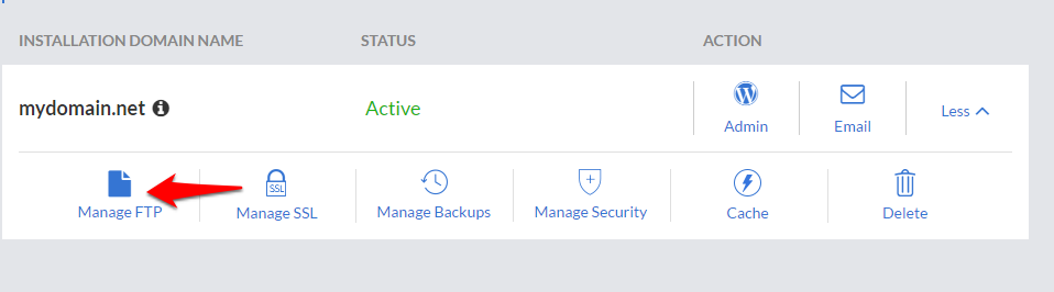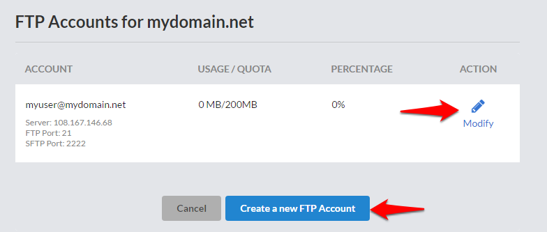 Click on Create New FTP Account to add a new FTP account. Or click on Modify to update or delete an existing FTP account.