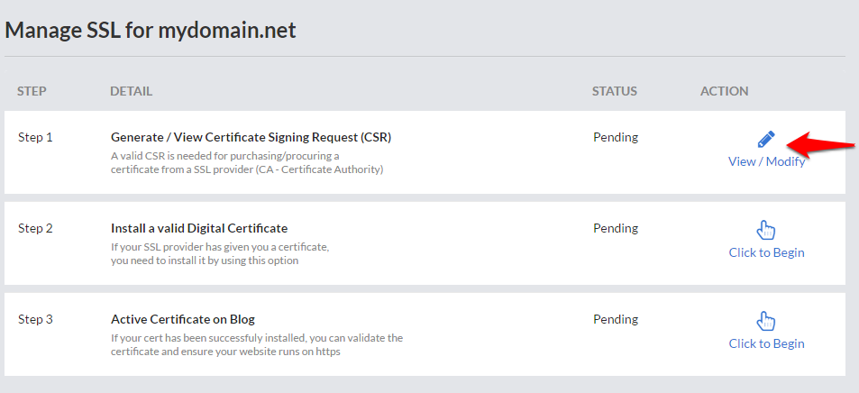 Click on the link next to Generate / View Certificate Signing Request (CSR) to generate a CSR.
