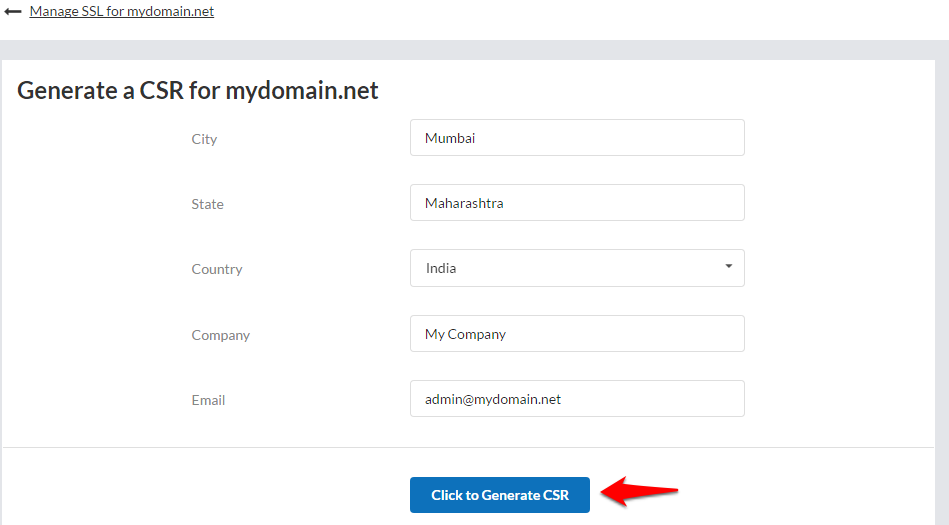 Fill in the details for the CSR and click on Click to Generate CSR.
