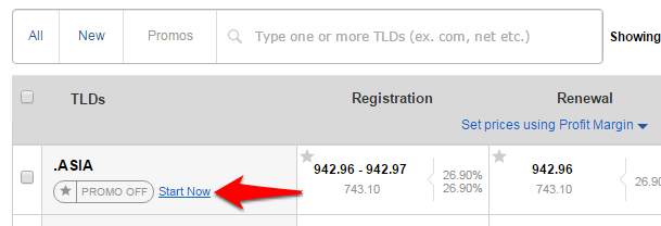 • Click on the Promos link to list the TLDs with available promos.