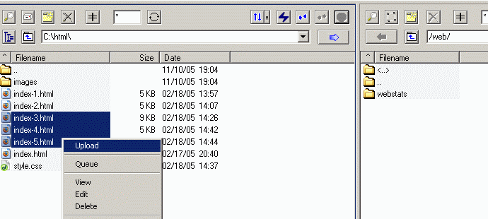 4. In the left pane, select a file to upload. Right-click on the file and choose Upload.